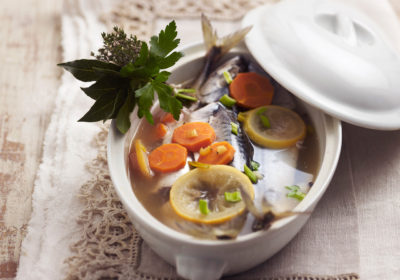 - Lever les filets des maquereaux crus et enlever la peau, les disposer dans un plat creux, ajouter le sel, le poivre, la moutarde, le jus de citron, le Noilly et la vodka.